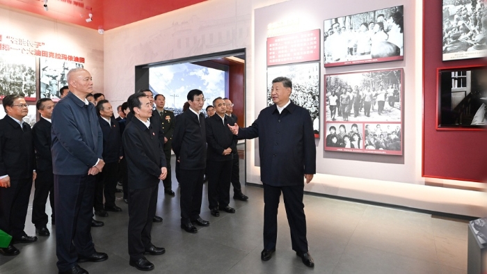 新疆ウイグル自治区を視察中の習近平中国共産党中央委員会総書記・国家主席・中央軍事委員会主席は9月24日午前、ウルムチ市内の文化センター展覧館で開催されている新疆ウイグル自治区成立70周年をテーマにした成果展を視察しました。