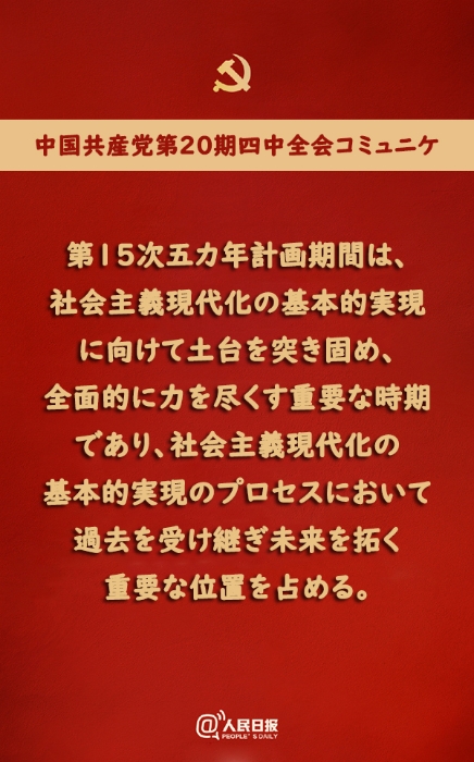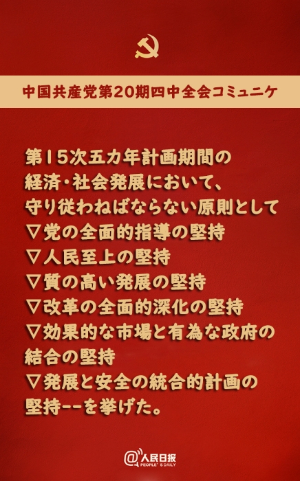 また、第15次五カ年計画期間の経済・社会発展において、守り従わねばならない原則として▽党の全面的指導の堅持▽人民至上の堅持▽質の高い発展の堅持▽改革の全面的深化の堅持▽効果的な市場と有為な政府の結合の堅持▽発展と安全の統合的計画の堅持--を挙げた。(編集NA)