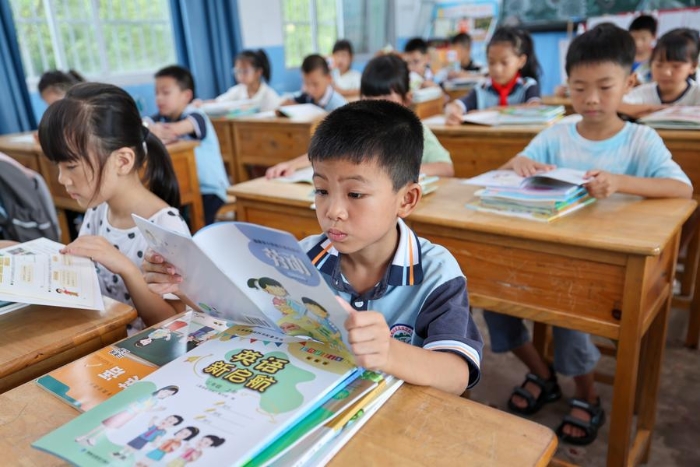 福建省武夷山市呉屯中心小学校の教室で教科書を読む児童。(9月1日撮影、武夷山=新華社配信/邱汝泉)